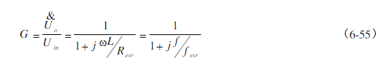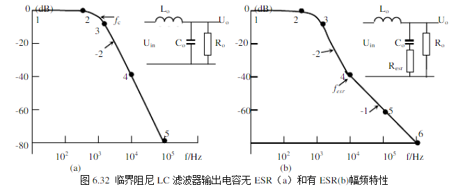 濾波電容有ESR的LC濾波器幅頻特性如圖6.35b的曲線123456。大多數(shù)濾波電容具有ESR。在f0以上的低頻段,容抗遠(yuǎn)遠(yuǎn)大于ESR,從Uo看到阻抗僅是容抗起主要效果,斜率仍為-40dB/dec;在更